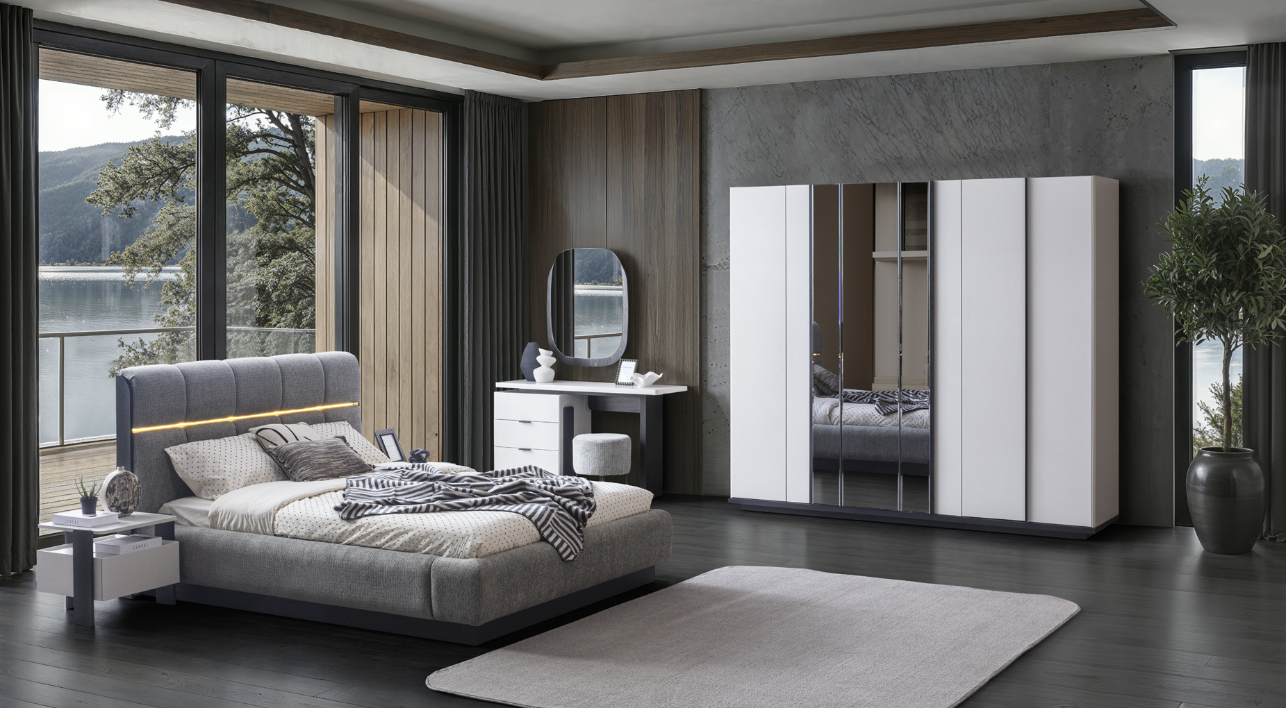 Eska Yatak Odası, geniş yatak formu ve dengeli mobilya yerleşimiyle huzurlu bir uyku alanı sunar. Yumuşak renk geçişleri ve modern detaylar mekâna ferahlık kazandırır. Fonksiyonel dolap ve şifonyer çözümleri, düzenli bir kullanım imkânı sağlar. Estetik sadelik, dinlendirici bir atmosfer yaratır. Eska Yatak Odası, günün temposundan uzaklaşmak için ideal bir ortam sunar.